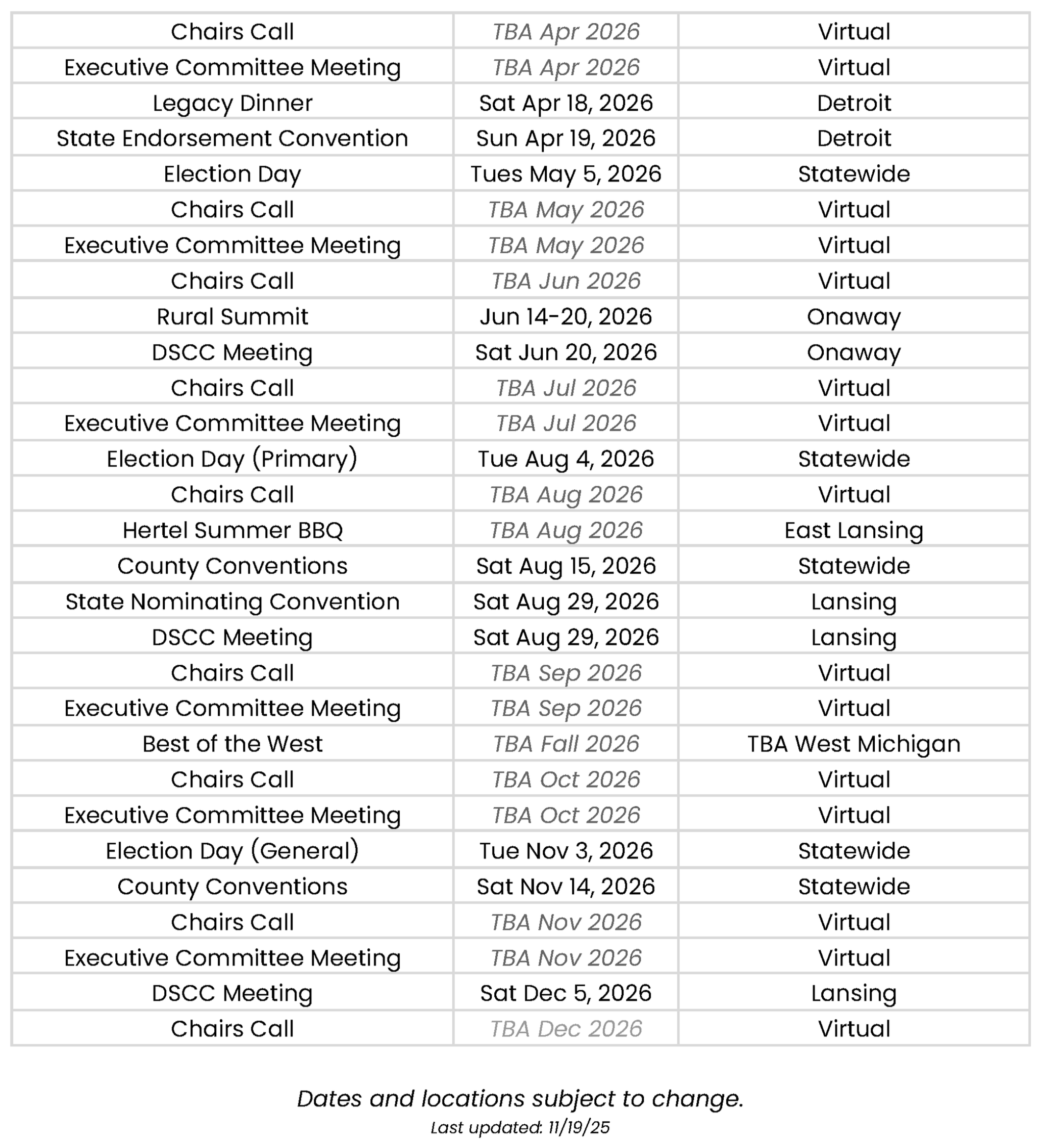 All members of the Michigan Democratic Party are encouraged to attend. Additional information, including the full Call to Convention, is available at https://michigandems.com/convention/.